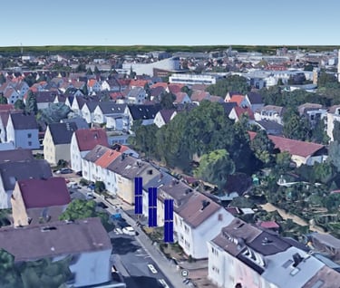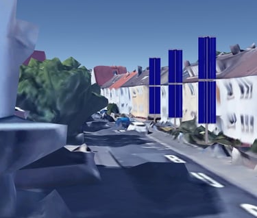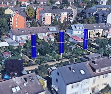Bringing Photo-voltaics into the neighbourhood is one of our main goals. We see roof installations on houses as difficult and costly. Cleaning and damage repair bills can heavily offset any gains from the energy collection. Large buildings with Solar Collection rooftop arrays, is obviously still a good way to utilize the roof space. We think the front garden or back garden or parking lot can also be used to collect energy. Each eCactus Tower will generate enough power (9Kw/hr @ 4-5 hours/day) for a typical residence. Double Module Towers (60sqm PV material) as shown below, could also be single module (30 sqm PV), resulting in less energy production, but perhaps not as intrusive into the people space.